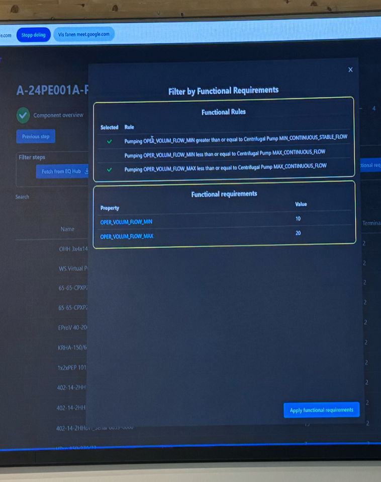 Etter trinnvis validering og filtrering står man igjen med et mindre sett av pumper, som alle oppfyller de ulike kriteriene. Da har man et godt utgangspunkt for å kontakte leverandører med forespørsler om leveringstid, pris med mer.